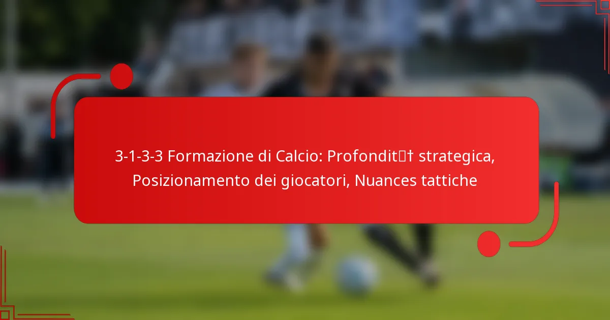 La formazione calcistica 3-1-3-3 è un assetto tattico che enfatizza una forte presenza a centrocampo garantendo al contempo stabilità difensiva. Con tre difensori, un centrocampista difensivo, tre centrocampisti e tre attaccanti, questa formazione offre flessibilità sia per strategie offensive che difensive. Prioritizzando il posizionamento dei giocatori, le squadre possono raggiungere un approccio equilibrato che si adatta efficacemente a diversi avversari.